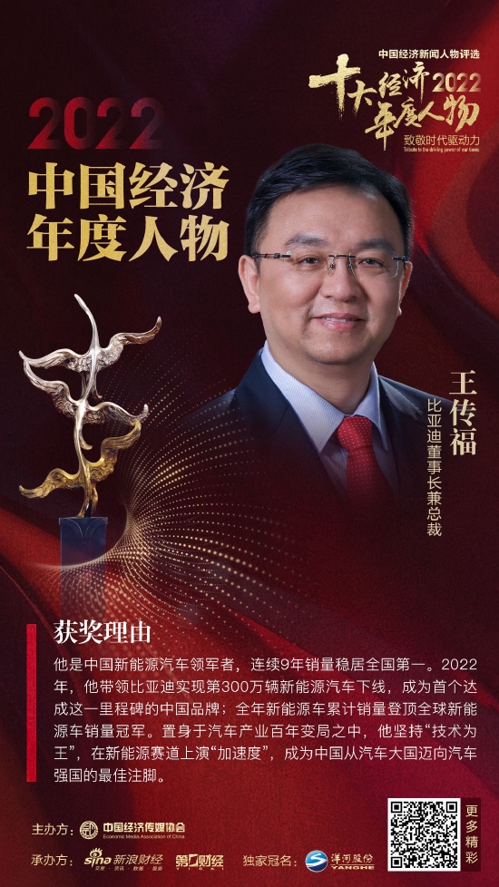 世界新能源车NO.1:比亚迪董事长兼总裁王传福当选2022中国经济年度人物