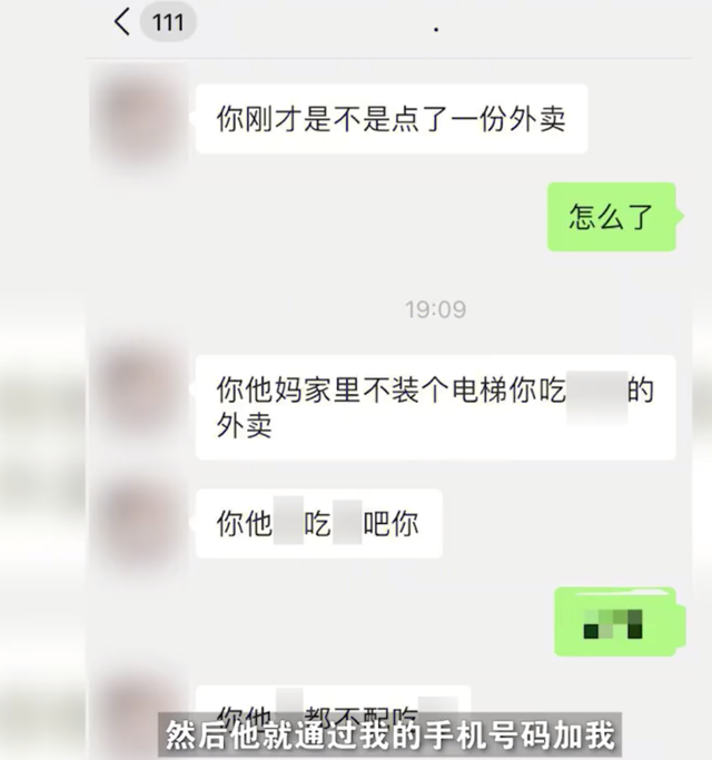 当事人刘先生称:“昨晚点了个外卖,点外卖的那部手机要没电了,就备注了我另一部手机的号码。然后他(骑手)就通过我的手机号码加我。送完之后添加了我的微信,然后就开始辱骂我。他骂的内容大概就是我们家为什么没有装电梯,没有电梯,你就不配点外卖这样子。我就投诉到了平台,也在等一个后续。”