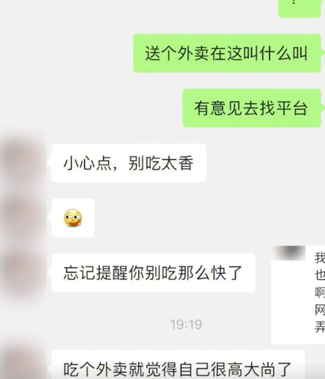 从刘先生晒出的聊天记录来看,该外卖骑手言语非常不堪。除了不停问候当事人外,该外卖骑手还提示称“小心点,别吃太香“、“忘记提醒你别吃那么快了”,言语中透露着自己在外卖中添加了不明物体的意思。随后,当事人以“辱骂顾客,疑似在外卖上下不明物体”为由向平台进行投诉。