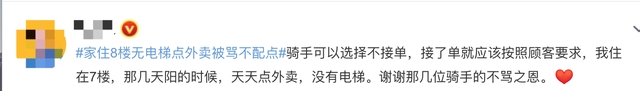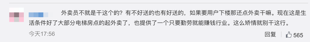 部分网友认为该外卖骑手行为不妥,称“这么矫情就别干这行”、“骑手可以选择不接单,接了单就应该按照顾客要求”,也有网友表示配送无电梯高楼层确实太累,可以增加配送费。