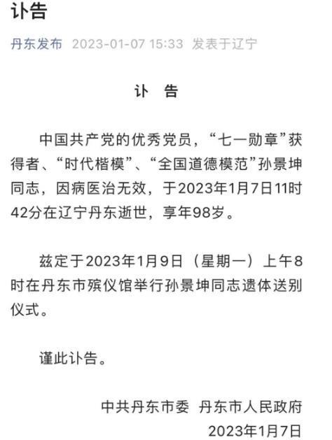 1月7日下午,据辽宁丹东市委宣传部官方微信公号消息,中共丹东市委、丹东市人民政府发布讣告称,中国共产党的优秀党员,“七一勋章”获得者、“时代楷模”、“全国道德模范”孙景坤同志,因病医治无效,于2023年1月7日11时42分在辽宁丹东逝世,享年98岁。兹定于2023年1月9日(星期一)上午8时在丹东市殡仪馆举行孙景坤同志遗体送别仪式。