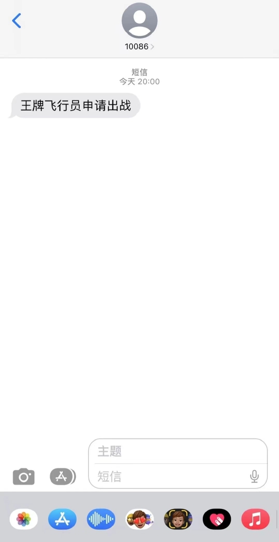今日,有中国移动用户表示,收到了来自中国移动官方客服10086的短信,内容为“王牌飞行员申请出战”。有些网友也表示同样收到了该内容,“有些莫名其妙,以为是诈骗短信”。