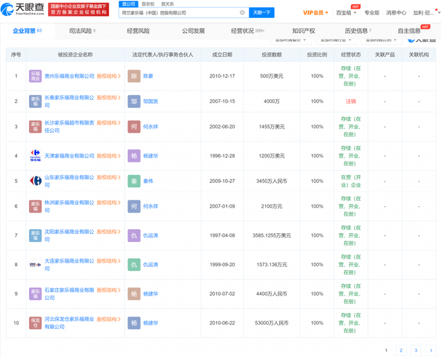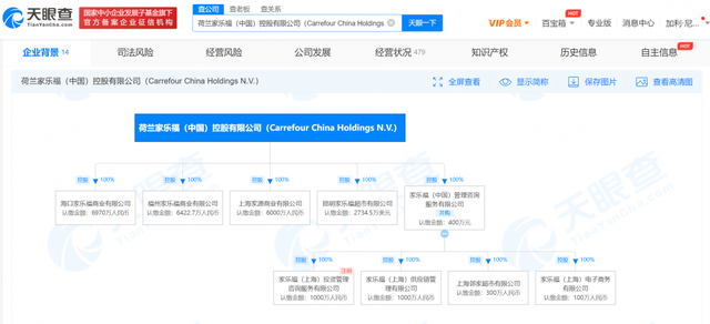 家乐福在国内多家公司控股股东均为荷兰家乐福(中国)控股有限公司,该公司对外投资30余家公司,包括家乐福(中国)管理咨询服务有限公司、家乐福(中国)超市投资有限公司、以及在北京、郑州、上海等多个城市成立的家乐福商业公司。其中,家乐福(中国)管理咨询服务有限公司下设4家全资子公司,包括家乐福(上海)电子商务有限公司、上海邻家超市有限公司等;家乐福(中国)超市投资有限公司下设6家全资子公司,包括苏福(上海)供应链科技有限公司及重庆、南京等地的苏福商贸公司;此外,家乐福各地商业公司多数拥有多家分支机构。