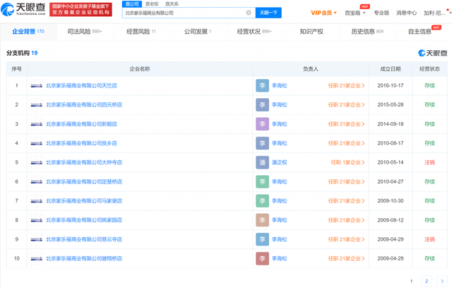 天眼查App显示,北京家乐福商业有限公司成立于1998年7月,注册资本约5166万美元,由荷兰家乐福(中国)控股有限公司持股55%。北京家乐福旗下拥有19家分支机构,其中大钟寺店和慈云寺店已注销。