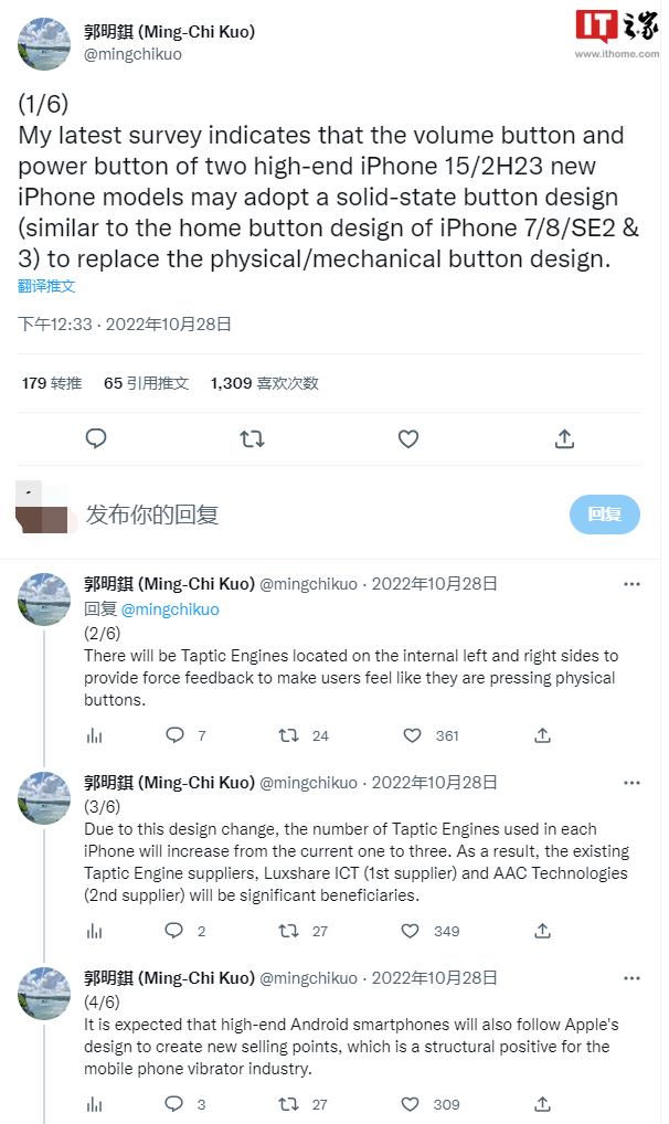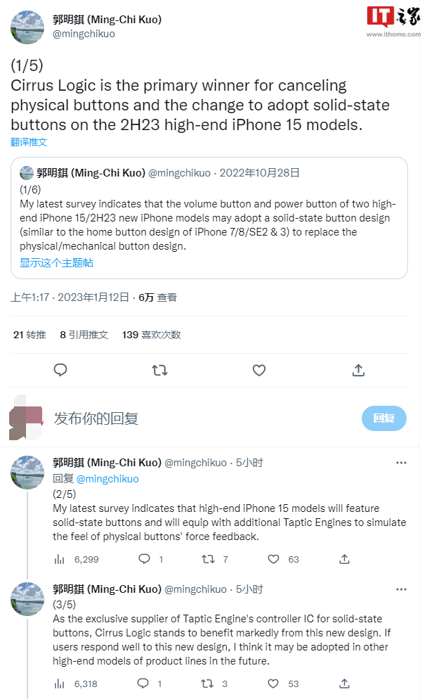 在今天的一系列推文中,郭明錤指出 Cirrus Logic 作为 iPhone 的 Taptic Engine 的控制 IC 芯片供应商将从这一变化中受益。
