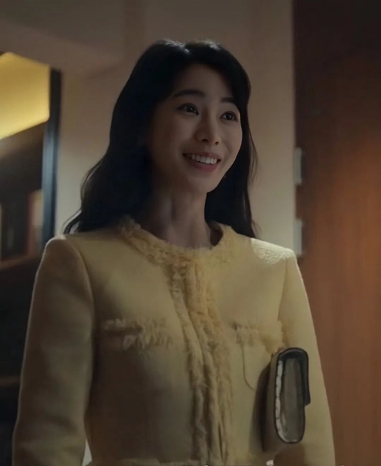 这身鹅黄色的毛呢西装套装也是把富家女的精致美展现得淋漓尽致。质感极佳的面料配上温柔的色彩,把整个人衬托得知性优雅,高贵而又气场十足,感觉一瞬间回到了《安娜》中真假千金的PK现场。