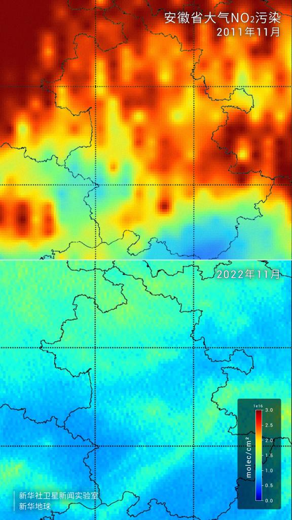 图为安徽省2011年和2022年大气二氧化氮污染分布图前后对比,图像显示污染明显好转。(中科院合肥物质科学研究院安徽光学精密机械研究所供图)