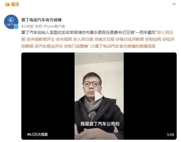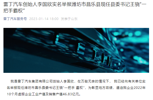 1月14日,雷丁汽车集团官方微博发布了一封实名举报信,雷丁汽车创始人李国欣实名举报潍坊市昌乐县现任县委书记王骁,称对方为彰显地方政绩,逼迫雷丁汽车2022年10个月虚报企业工业产值及销售产值46.83亿元。自2022年3月起,共逼迫雷丁汽车等当地大企业虚报企业工业产值和销售产值数百亿元。