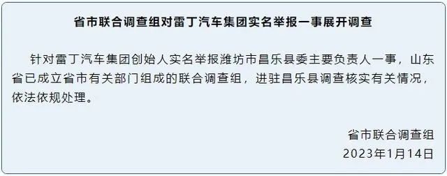 据“潍坊发布”消息,针对雷丁汽车集团创始人实名举报潍坊市昌乐县委主要负责人一事,山东省已成立省市有关部门组成的联合调查组,进驻昌乐县调查核实有关情况,依法依规处理。