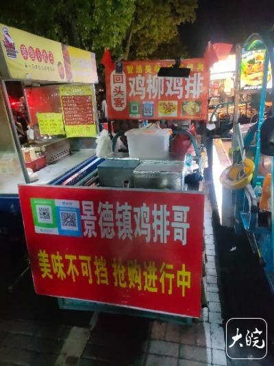 “鸡排哥”的摊位距离景德镇中国陶瓷博物馆不远,一条约两百米长的小吃一条街。30日晚9点半,大皖新闻记者赶到现场时,“鸡排哥”的三轮车摊位前围满顾客,每人限购2份,三轮车上写着“回头客”“景德镇鸡排哥”等宣传语。