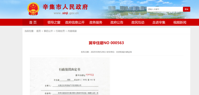近日,辛集市住房和城乡建设局根据相关法律法规,对一起违规行为作出行政处罚决定(文书编号:冀辛住建NO000563)。该处罚于2025年9月29日通过辛集市政府官方网站“事后公开·行政处罚”栏目正式公布。