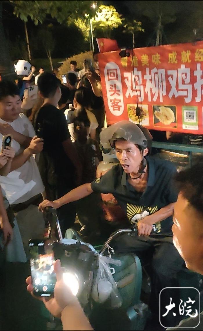 “谢谢大家!谢谢大家!”把摆摊物品搬上三轮车后,“鸡排哥”一边和热情粉丝打招呼,一边拧钥匙启动三轮车。“让一下!让一下!谢谢!”有人提醒给“鸡排哥”让路。“鸡排哥”很快驾车突出“重围”离开。