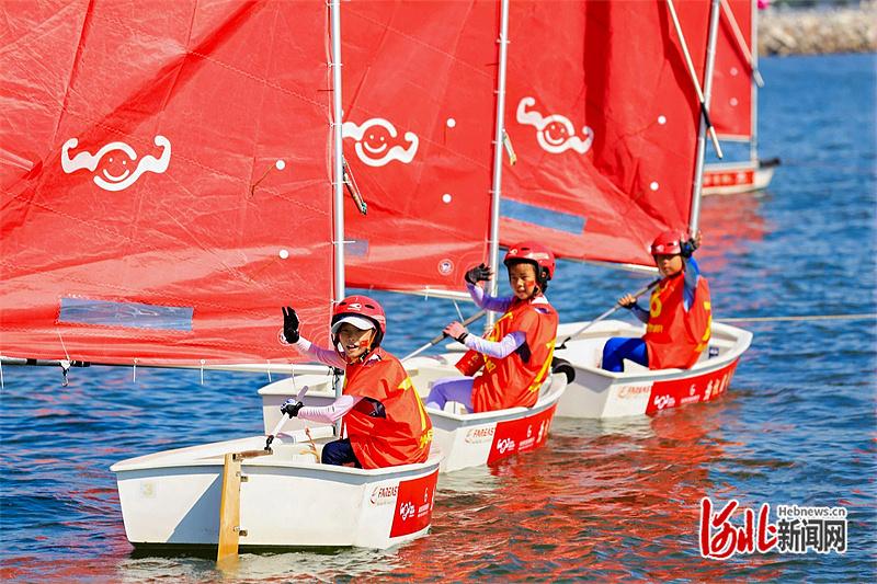 10月1日,参加2025年“为祖国升帆”活动的杨雅思晗(左一)操作帆船,用升帆礼节为祖国庆生。河北日报记者 孙也达摄