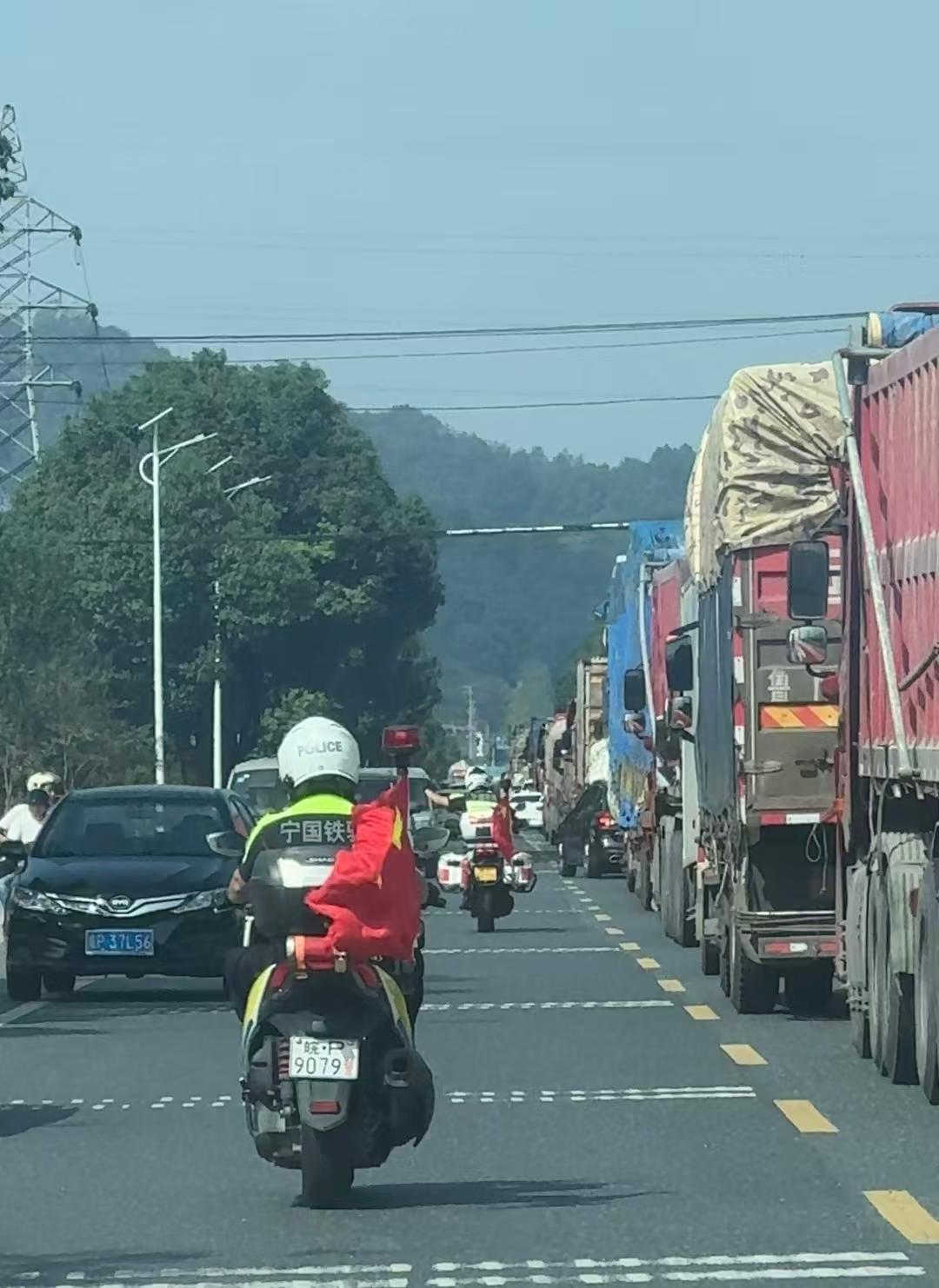 视频中,拍摄者前方,两位身着“宁国铁骑”字样的交警骑着摩托车。同向车道上,一些路段十分拥堵,铁骑队员在前方逆行开道、引路,带着求助群众乘坐的车安全前行。