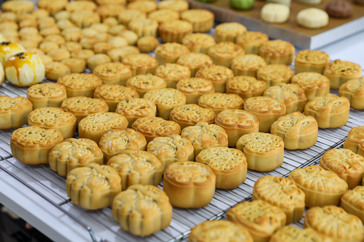 “今年销量比去年同期销售涨了两成,从九月初就陆续有订单,这几天更是迎来了销售高峰,每天线上团购和零售加起来得有500多枚。尤其是今年新推出的流心月饼特别受欢迎。”店长李晓悦介绍。