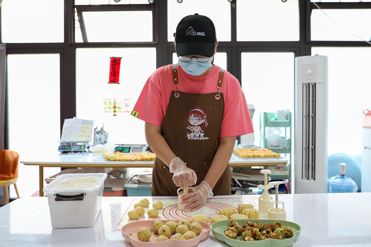图为壹米家手工零食烘焙坊店长赶制月饼。李浩摄