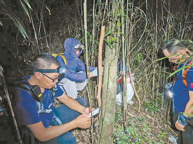 17时48分,队员牛哥、飞叔与桂丽陆续赶到天竺山,三人短暂整理装备、明确搜救方向后,迅速踏入夜色渐浓的山林。