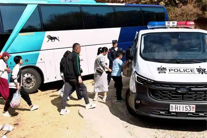 考虑到车辆救援需要一段时间,民警当场决定先行转移游客。交管大队民警随即向上级请求增派转运车辆,并与延吉市文广旅局联系确定安置地点。随后,文旅部门工作人员赶赴现场,协助救援。由于现场道路崎岖,救援人员采取警车分批转运的方式,先将游客送至东来寺停车场,再由警用大巴统一转运至市区指定酒店。