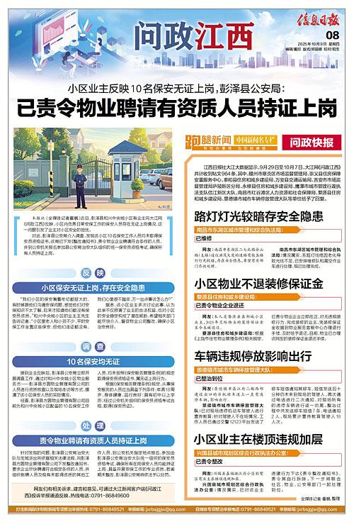 本报讯 (全媒体记者崔帆)近日,彭泽县和兴中央城小区有业主向大江网《问政江西》反映,小区内负责日常安保工作的保安人员存在无证上岗情况,这一问题引发了业主对小区安全的担忧。