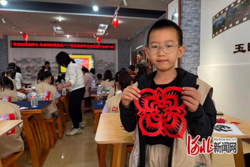图为“传统民俗润童心非遗剪纸传技艺”活动现场,小朋友展示自己的作品。