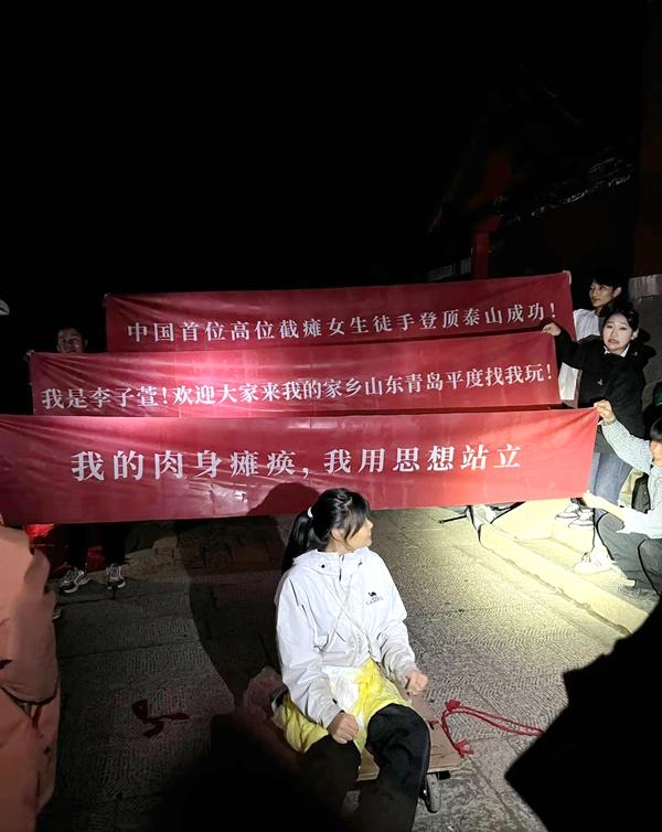 鲁网10月9日讯(记者 潘亚妮 实习记者 刘悦)10月7日晚9时许,山东泰山南天门见证了一场震撼人心的突破:青岛平度00后女孩李子萱,以高位截瘫之躯,耗时55小时全程自主攀爬,成为国内首位独立完成泰山登顶的高位截瘫者。这场跨越生理极限的挑战,不仅刷新了公众对残障群体能力的认知,更以“轮椅上的攀登者”之姿,向世界传递出“生命平等、尊严无界”的强烈信念。