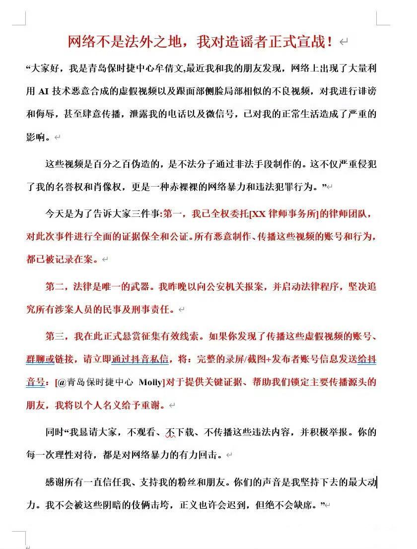 大皖新闻讯 “网络不是法外之地,我对造谣者正式宣战!”10月10日,在青岛保时捷中心工作的牟女士在社交媒体上发出这样一则“宣战书”,就自己遭遇AI恶意合成不雅视频一事公开维权。