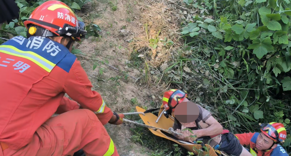 消防救援人员抵达现场后发现,一名老人被困在悬崖下3米的草丛,离悬崖底约10米。根据现场掌握的实际情况,消防救援人员首先在悬崖边设好锚点,将救援绳释放至被困人员位置,防止被困人员继续往下坠落。随后,让一名救援人员穿戴好防护装备携带三角吊带,利用绳索救援技术下降至被困人员位置,在为被困人员穿戴好三角吊带后,通过绳索将被困人员提拉上升至安全区域,再使用担架将老人移动至马路,并交由医护人员。