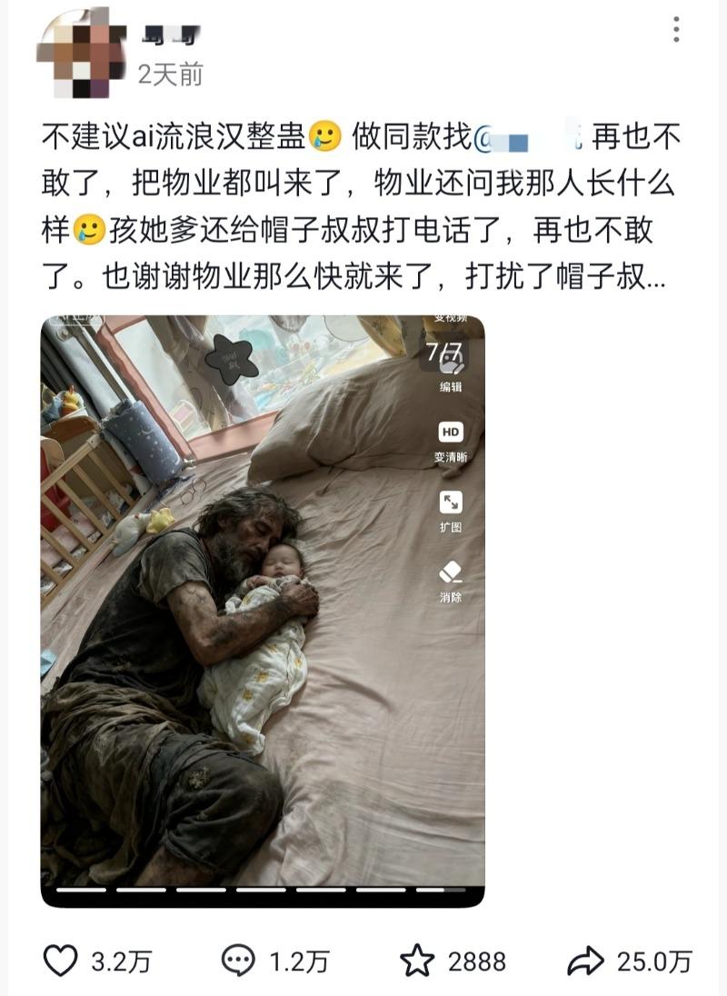 大皖新闻记者注意到,近段时间,用AI制作流浪汉进家的图片来整蛊家人的视频在某短视频平台持续走红,参与者众多,甚至有的视频点赞量突破40万。视频画面显示,网民们通过AI制作了一名衣衫褴褛的流浪汉进入家中,甚至躺在卧室床上的图片,发给家人后,对方都颇感诧异,此类视频也被打上了“搞笑视频”的标签。