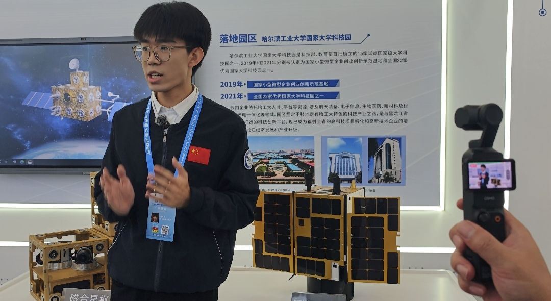 在航天科技展区,哈尔滨工业大学2022级小卫星班的本科生姚尊皓正围着模型介绍:“这可不是普通卫星!这是我们研发的‘磁合星枢’平台,就像给卫星装上了再生细胞。”