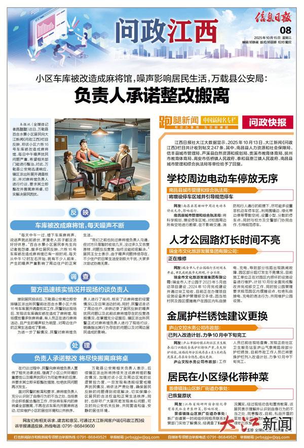 本报讯(全媒体记者吕甜甜)近日,万载县百合水景小区居民向大江新闻《问政江西》栏目反映,称该小区六栋16号车库被改造成麻将馆,每日中午噪声扰民问题严重,希望相关部门能进行整治。对此,万载县公安局迅速响应,辖区派出所展开调查核实,并对麻将馆负责人进行约谈,要求其立即整改并搬离麻将桌,切实解决居民困扰。?