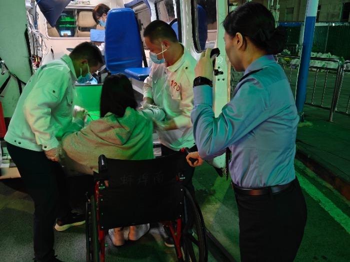 9号站台是蚌埠南站距离候车室距离最远的站台。急救送医要快,骨折病人怕颠,从无障碍电梯到达天桥、从天桥进入二楼候车室,从二楼候车室下行至一楼候车室出站前往急救绿色通道的一路上,陆成瑶和李健轮流推轮椅时都既注意脚下步子轻,又注意攥着轮椅的手上力道得匀匀加劲儿,到达站前绿色通道落客平台后,俩人配合到达的医护人员慢慢把杨女士送上救护车。晚上7时45分,救护车朝着蚌埠医科大学第二附属医院驶去。经检查,杨女士系颧骨骨折后引发的枕神经痛,目前身体情况已恢复。