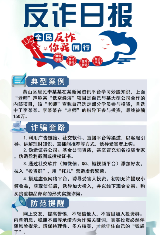 大皖新闻讯 10月14日,黄山市反电诈中心发布一起典型案例,在这起案例中,黄山市黄山区李某某“炒股”被骗150万元。