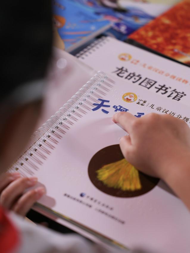 视障儿童在阅读《小羊上山 大字·盲文版》