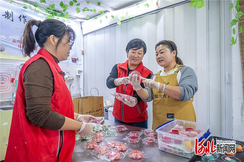 10月9日,耿娟(右二)和队员一起制作喜饼。河北日报记者 赵杰摄