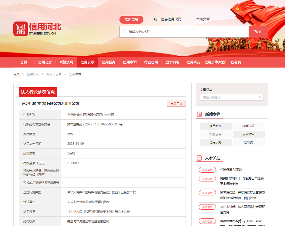 近日,秦皇岛市海港区市场监督管理局依法对东芝电梯(中国)有限公司河北分公司作出行政处罚,罚款人民币2万元。该处罚决定书(文号:冀市监秦处﹝2025﹞13030225000318号)已于2025年10月9日正式下达。