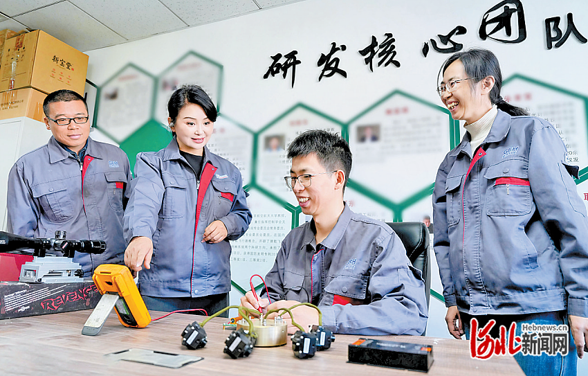 10月13日,梁小宏(左二)在实验室与同事们探讨产品研发计划。 河北日报记者 王伟摄