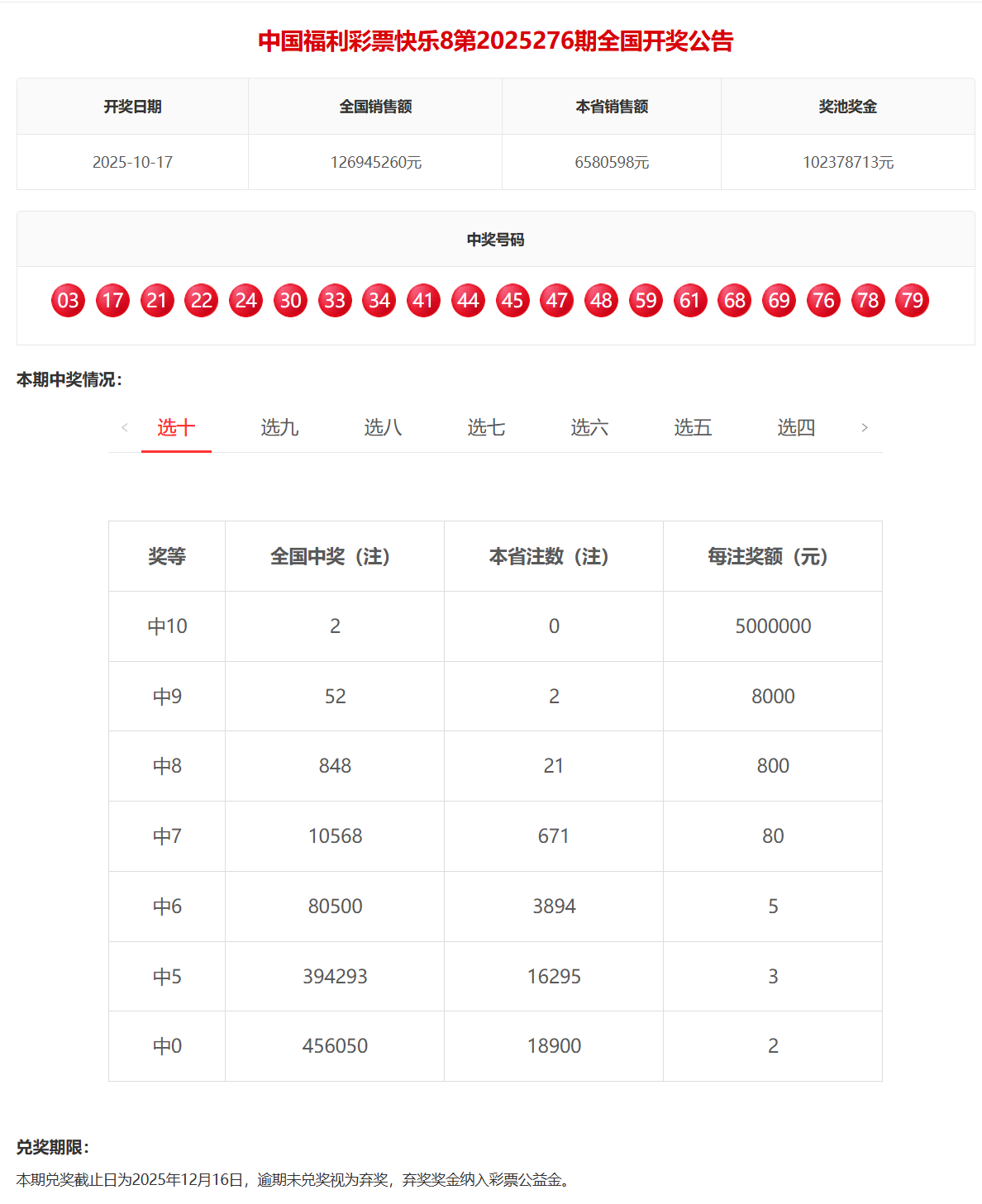大皖新闻讯 10月17日晚,安徽福彩网更新了彩票开奖公告。其中,快乐8开出两注“中10”大奖,每注奖金500万元。具体如下: