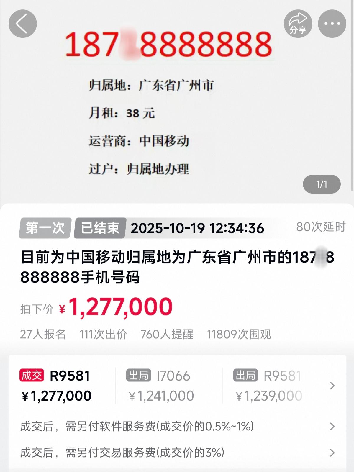 大皖新闻记者从竞买记录看到,为了吸引更多人参与竞拍,此次两个号码设置起拍价都为1000元,经过激烈竞拍后,产生了溢价。其中,187*8888888号码吸引了27人报名竞拍,通过111次出价竞争,最终拍出127.7万元;189*8888888号码吸引了33人,125次出价,最终被95.3万元拿下。值得提醒的是,这两个号码并不是司法拍卖,因此还需要额外支付软件服务费(成交价的0.5%-1%),以及交易服务费(成交价的3%)。