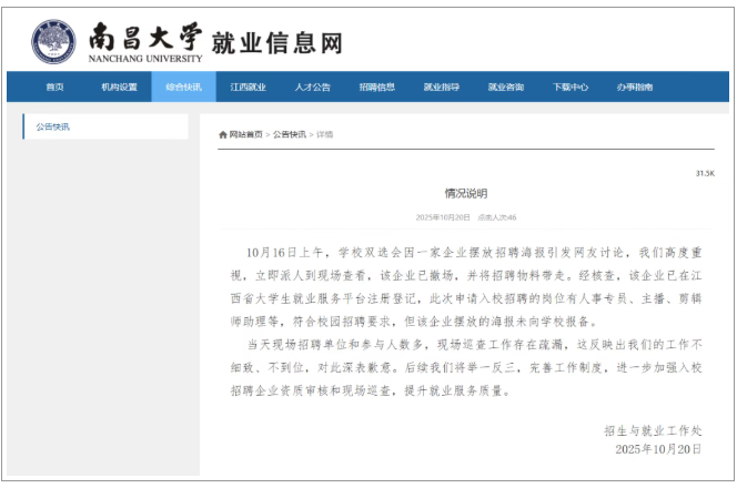 10月16日上午,学校双选会因一家企业摆放招聘海报引发网友讨论,我们高度重视,立即派人到现场查看,该企业已撤场,并将招聘物料带走。经核查,该企业已在江西省大学生就业服务平台注册登记,此次申请入校招聘的岗位有人事专员、主播、剪辑师助理等,符合校园招聘要求,但该企业摆放的海报未向学校报备。