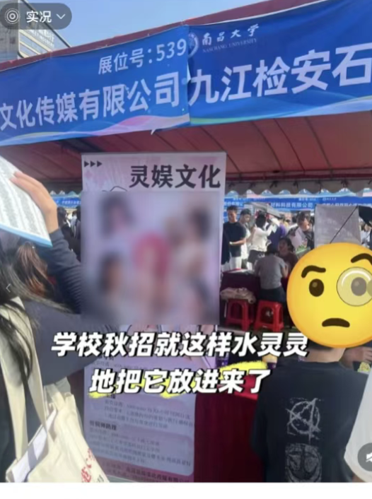 据媒体此前报道,近日,有网友发帖称,江西某211招聘现场现露骨女主播招聘海报,在其拍摄的照片中,展位号后带有南昌大学标识。