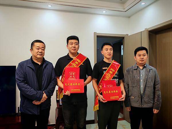 鲁网10月21日讯(记者 于胜涛 通讯员 王璐)日前,青岛市即墨区委政法委副书记付强带领区见义勇为协会工作人员来到环秀街道前南庄村为用鱼竿合力救起落水老人的胡伟鑫和盛祥展两位同志颁发“即墨区见义勇为先进群体”荣誉证书和奖金。