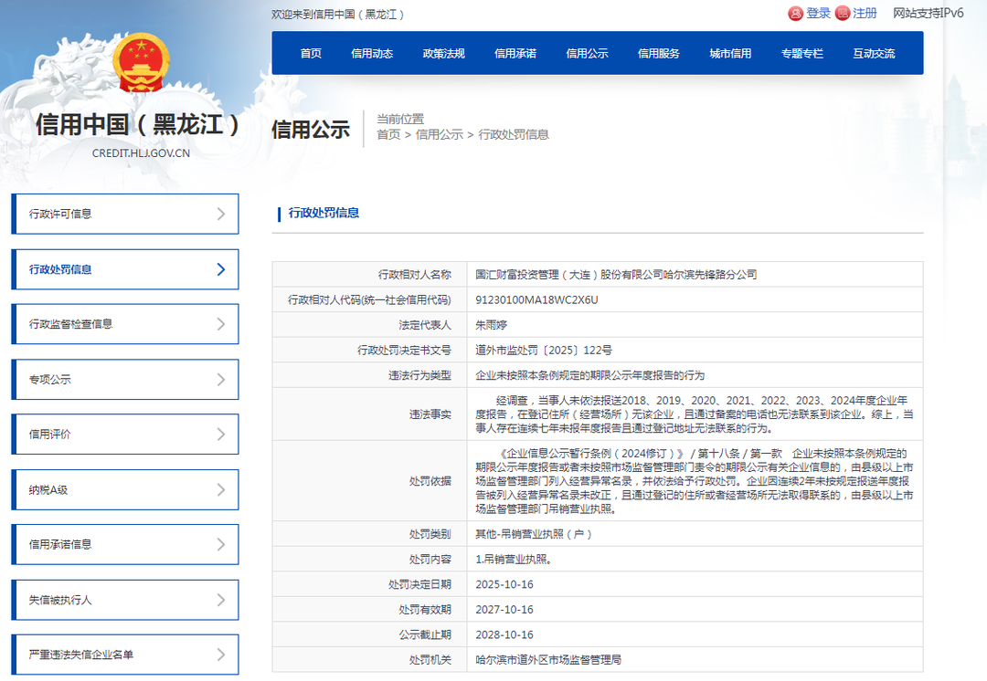 对此,哈尔滨市道外区市场监督管理局依据《企业信息公示暂行条例(2024修订)》 第十八条第一款,对国汇财富哈尔滨先锋路分公司作出吊销营业执照的行政处罚。处罚决定书文号:道外市监处罚〔2025〕122号。