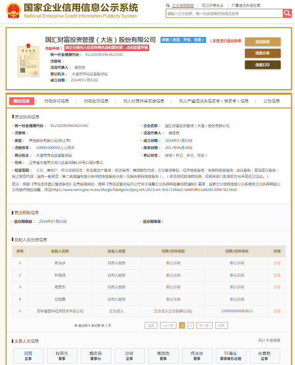 国家企业信用信息公示系统显示,国汇财富投资管理(大连)股份有限公司哈尔滨先锋路分公司成立于2015年,负责人朱雨婷。其母公司国汇财富投资管理(大连)股份有限公司成立于2014年,注册资本10000万元,法定代表人魏忠良,大股东为吉林省塑料研究院下属国有企业——吉林省塑料经济技术开发公司。