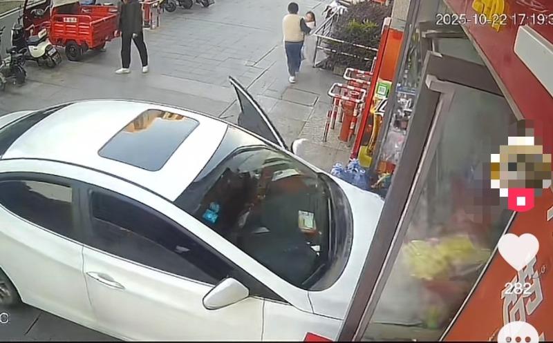 大皖新闻讯 10月23日下午,有网民在社交平台分享了一段发生在22日傍晚的惊险经历:在武汉江夏区杨桥湖大道附近,一辆白色轿车突然从路边撞断隔离栏杆,冲上人行道,径直冲入一家便利店内。店主邓女士告诉记者,事发时她的丈夫正坐在柜台看店,“幸好人没事,只是手臂有点拉伤。”