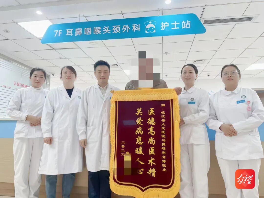 然而,由于他全身基础疾病较多,手术风险极高。面对挑战,耳鼻喉科启动了多学科联合会诊(MDT),MDT专打高端局,集结相关科室专家力量,全面评估、周密论证,最终为他量身定制了安全可行的手术方案,成功排除了潜在风险。手术如期顺利进行。在医护团队的精心治疗和照料下,他恢复良好,症状改善明显,从“雷震子”变成了静音模式,卧榻之侧,终能安睡。康复出院并专程送来锦旗,以表达对科室全体医护人员为他按下“静音键”的感激之情。