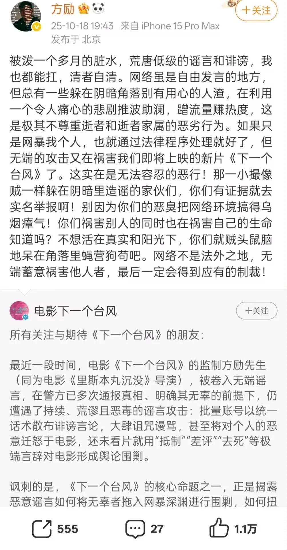 10月18日,方励通过个人社交账号发文称,无端的攻击又在祸害他们即将上映的新片《下一个台风》,实在无法容忍。同日,电影《下一个台风》官方账号也发文称,最近一段时间,电影监制方励被卷入无端谣言,在警方已多次通报真相、明确其无辜的前提下,仍遭遇了持续、荒谬且恶毒的谣言攻击,批量账号以统一话术散布诽谤言论,大肆诅咒谩骂,甚至将对个人的恶意迁怒于电影,还未看片就用“抵制”“差评”“去死”等极端言辞对电影形成舆论围剿。 电影《下一个台风》将坚持在10月25日全国公映,绝不退缩。