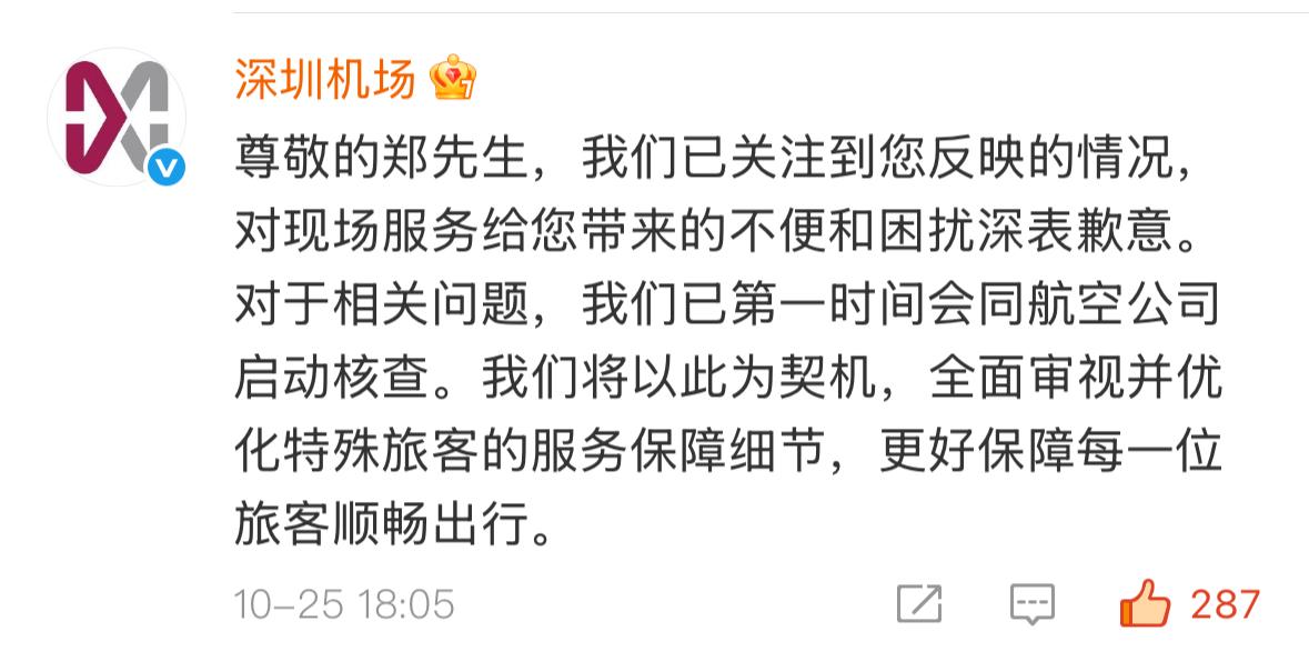 10月25日晚,“深圳机场”微博在郑智化微博评论区回复:尊敬的郑先生,我们已关注到您反映的情况,对现场服务给您带来的不便和困扰深表歉意。对于相关问题,我们已第一时间会同航空公司启动核查。我们将以此为契机,全面审视并优化特殊旅客的服务保障细节,更好保障每一位旅客顺畅出行。
