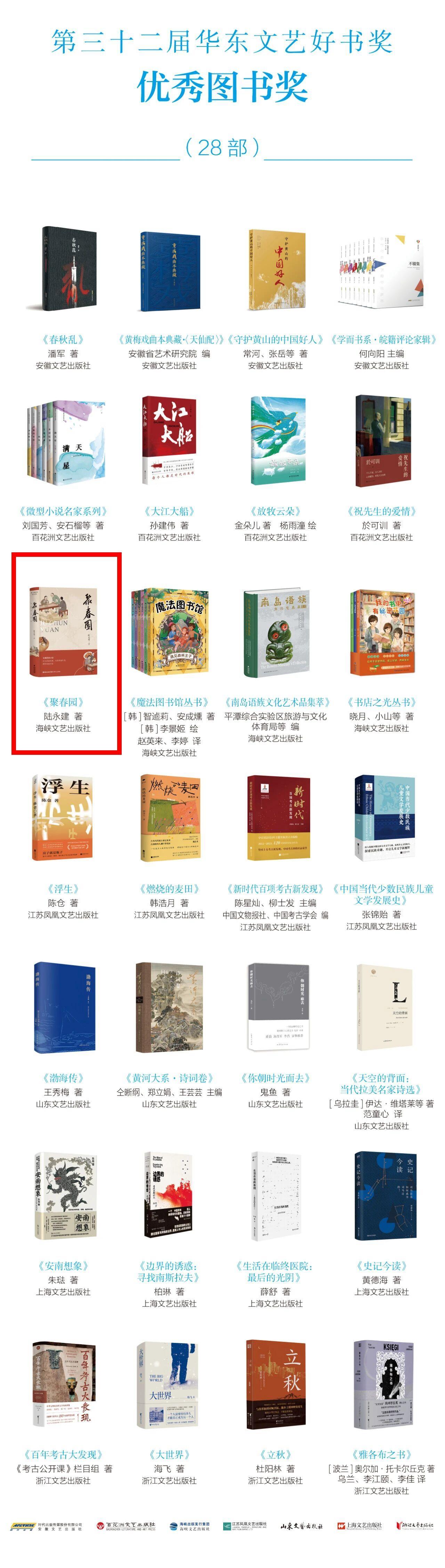 其中,由海峡文艺出版社出版发行的《聚春园》荣获第三十二届华东文艺好书奖优秀图书奖。长篇小说《聚春园》是作者陆永建五年成一书的精品力作。小说以清末为时间起点,叙述了闽菜代表者之一的聚春园的发展历程。作品以小见大,以郑春发家族故事为主线,重现旧时福州城的人间烟火气,同时,巧妙地将个人命运、家庭兴衰与国家历史相结合,通过一系列精彩纷呈的故事叙述,展现福建地区自近代以来的社会变迁、经济波动以及文化交融。