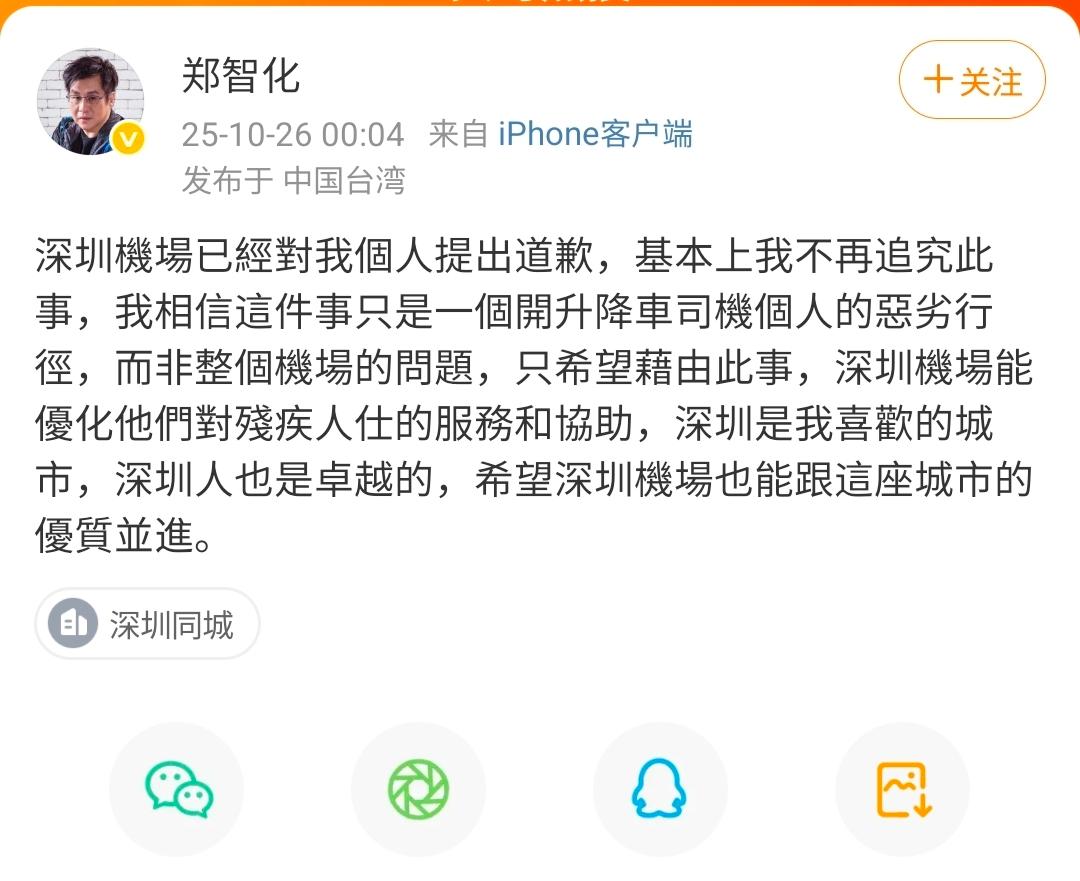 10月25日晚,“深圳机场”微博在郑智化微博评论区回复:尊敬的郑先生,我们已关注到您反映的情况,对现场服务给您带来的不便和困扰深表歉意。对于相关问题,我们已第一时间会同航空公司启动核查。我们将以此为契机,全面审视并优化特殊旅客的服务保障细节,更好保障每一位旅客顺畅出行。