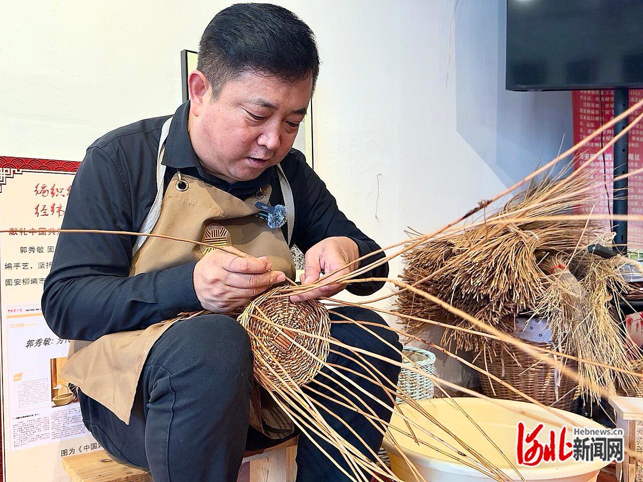 9月12日,张万富在向记者演示讲解固安柳编技艺。河北日报见习记者 崔玉洁摄